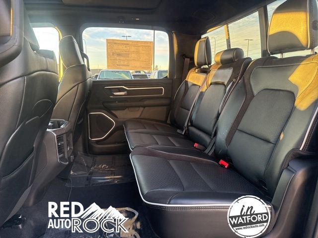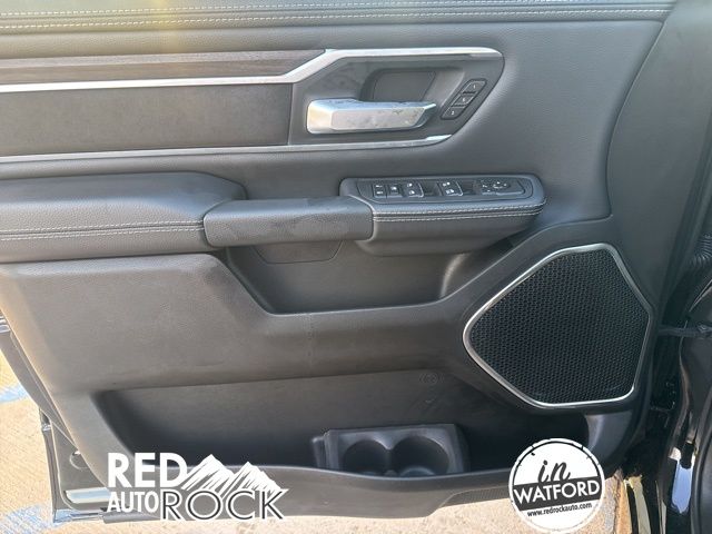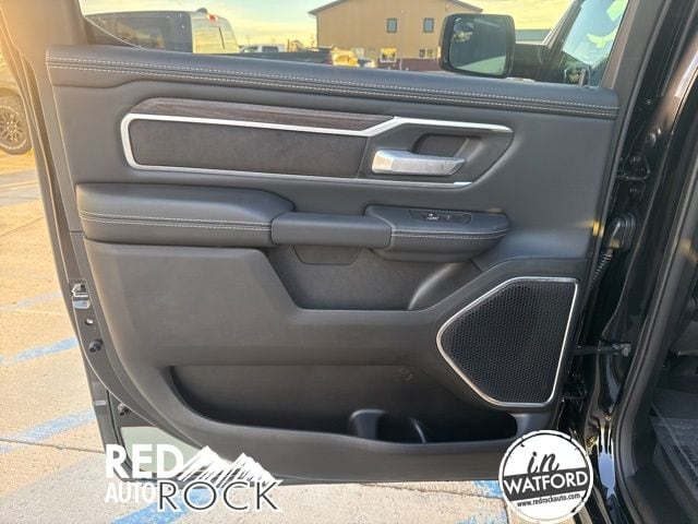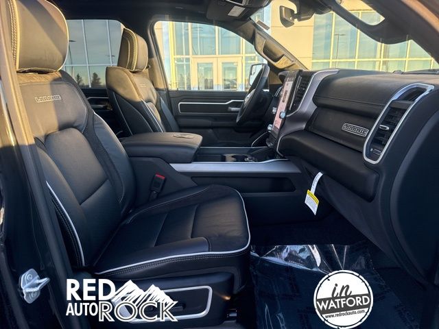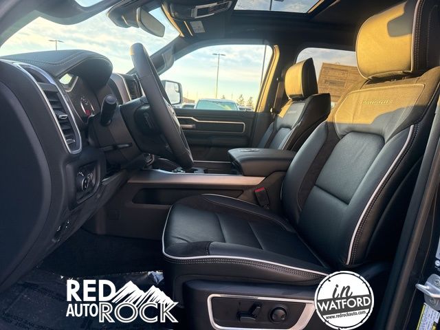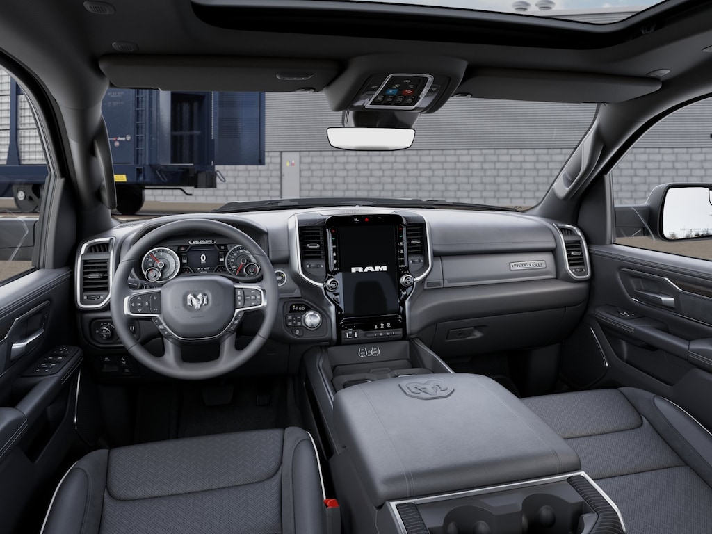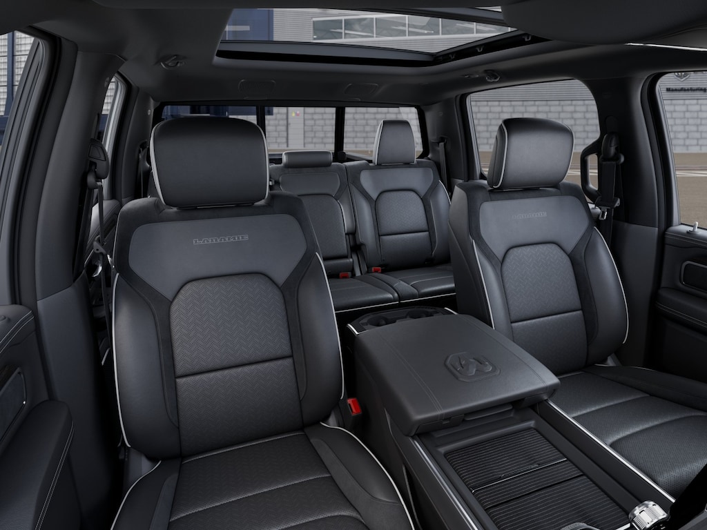 This Laramie trim level offers a premium experience with features like a 12-inch Uconnect 5 Navigation display, a panoramic sunroof, and a suite of advanced safety technologies. The sleek black exterior is complemented by stylish 20-inch wheels, while the spacious cabin boasts luxurious leather-trimmed seats with heating and ventilation.
